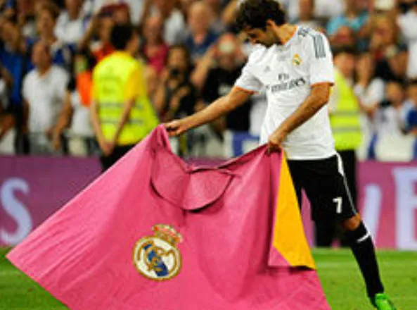 Real Madrid's Raul Gonzalez holds a bullfighting cape with the emblem of the Real Madrid after winning the Spanish league soccer championship at the Santiago Bernabeu stadium in Madrid, Sunday, May 18, 2008.