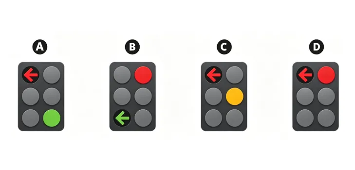 23. You are in the left-hand lane at traffic signals. You are waiting to turn left. At which of these traffic signals may you move on?