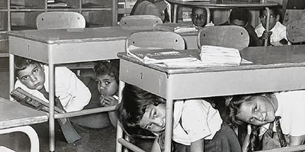 During the early days of the Cold War, schools conducted duck-and-cover drills to prepare for an atomic attack. These drills involved students hiding under their desks in protective positions.
