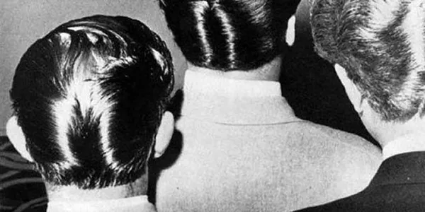The ducktail is a hairstyle popular in the 1950s, characterized by hair combed back on the sides and tapered into a point at the back, resembling a duck's tail. It was commonly associated with rock and roll culture and worn by young men.