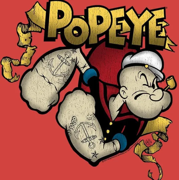 Popeye the Sailor Man promotes spinach with his mighty muscles.