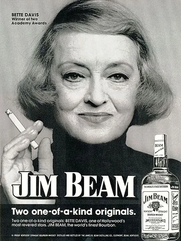 Bette Davis appeared in print advertisements for Jim Beam in 1974. The ads featured the iconic actress, who was in her late 60s at the time, promoting the bourbon. The campaign included the famous tagline, "Fasten your seatbelts, it's going to be a Beam-y night".