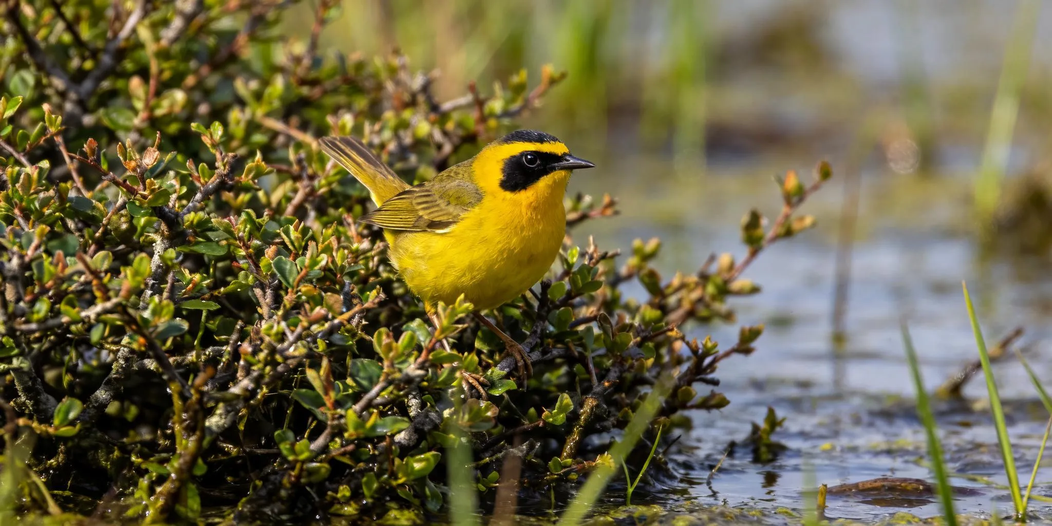 The Common Yellowthroat is a type of warbler often found in thickets. The male's black mask makes it look like a tiny feathered bandit.