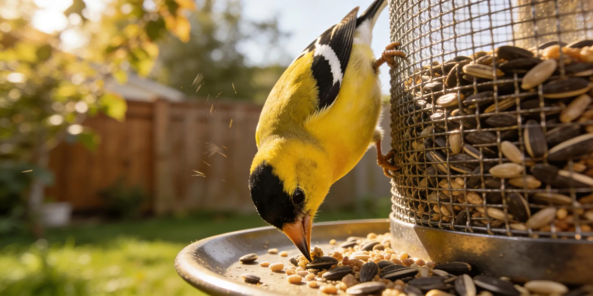 Goldfinches are strict vegetarians. They especially love Nyjer (thistle) seeds and sunflower hearts, often clinging to mesh feeders to eat.