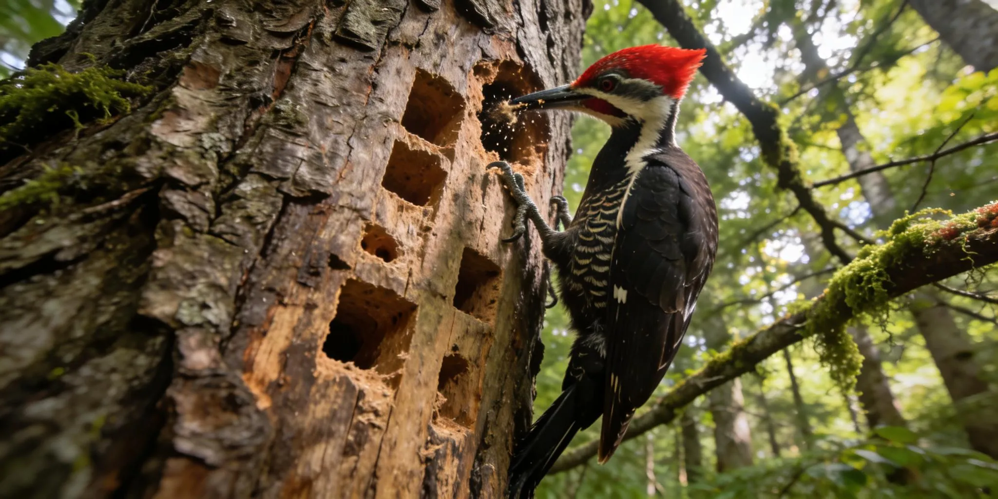 The Pileated Woodpecker is nearly the size of a crow and is famous for leaving large, rectangular holes in trees as it searches for carpenter ants.