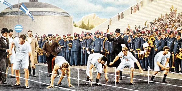 In the men's 100-meter final at the 1896 Olympics, five athletes stood on the track. American athlete Ryan bent his knees slightly, his arms crossed in front of his body; Hungarian athlete Szokoli placed his left foot in front, his right foot behind, his arms outstretched. German athlete Hoffmann planted two small wooden sticks in the ground, supporting himself with his hands. American athlete Booker, with his palms pressed downward, crouched on the ground, earning spectators the nickname "all fours." Greek athlete Kalkokondilis stood upright, his upper body slightly leaning forward. Five athletes, five different poses.