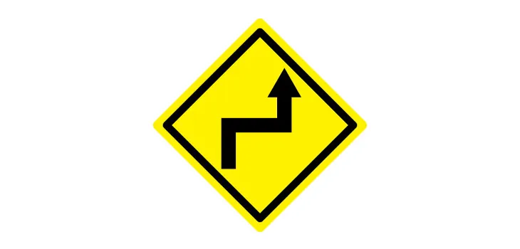 「右(左)背向屈折あり」は、前方で道路が急激に折れ曲がり(屈折)、連続するヘアピンカーブ(S字)があることを予告する黄色い「警戒標識」です。