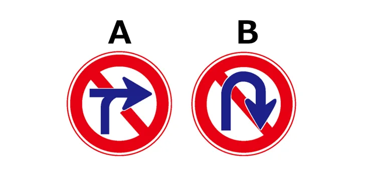 Bの標識が「転回禁止」、Aは「車両横断禁止」です。"転回"とは、いわゆるUターンのこと。「転回禁止」は、道路幅が狭い、交通量が多いなど、転回を行うことで、歩行者や対向車に迷惑をかけるおそれのある区間や交差点に設定されます。