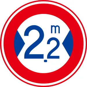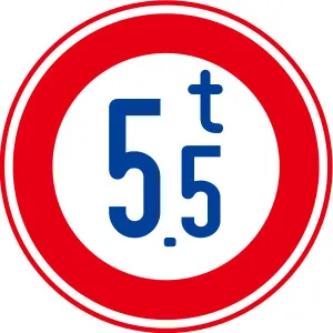 「最大幅」の規制標識は、赤枠の中に青色の山形(左右)と数字が描かれ、積載物を含む車両の全幅がその数値を超える車両の通行を禁止する標識です。道幅が狭い場所や構造物がある場所に設置され、制限幅を超える車は左折や通行ができません。
