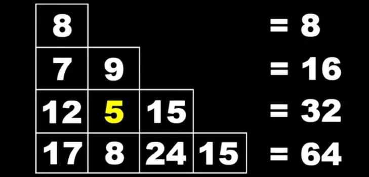 각 줄의 숫자를 모두 더하면 바로 위 줄의 숫자의 두 배가 됩니다. 여기서 맨 위 줄은 8, 다음 줄은 16, 그 다음 줄은 32, 마지막 줄은 64입니다.